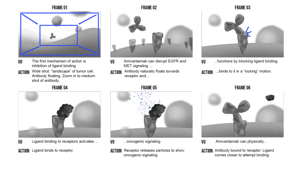 With the research complete, I drafted the voice-over script to clearly articulate Cytovexin’s mechanism: “By binding to fibroblast growth factor receptors, Cytovexin can disrupt downstream activation and signaling that would contribute to cancer growth. When the ligand attempts to bind to the fibroblast growth factor receptor, Cytovexin can physically block this interaction.” I then hand-drew storyboard frames in Photoshop, mapping out each key moment of the molecular interaction, and created an animatic to establish timing and pacing before moving into full production.