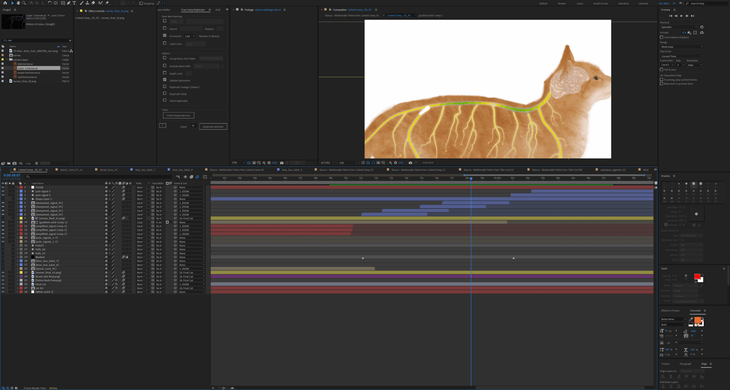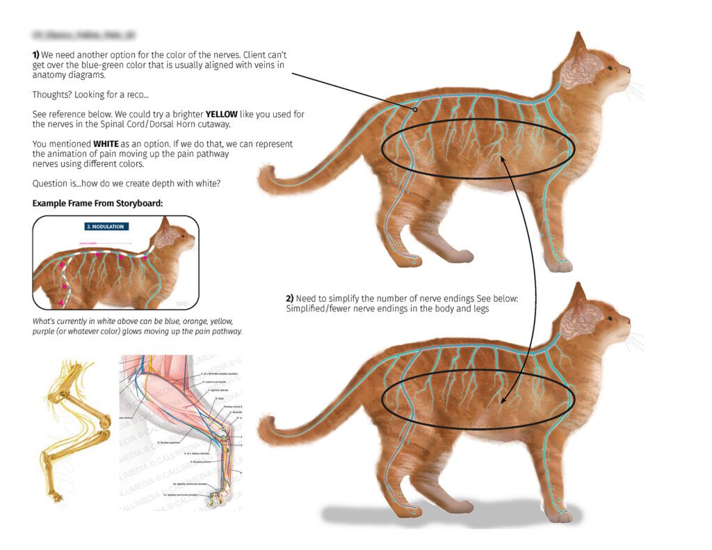 Technical execution included comprehensive storyboard development, pain signal animation along neural pathways, neurotransmitter visualization, live-action compositing, digital cat modeling for anatomical accuracy, seamless transitions between live and animated sequences, title screen animation, and zoomed callout graphic creation.